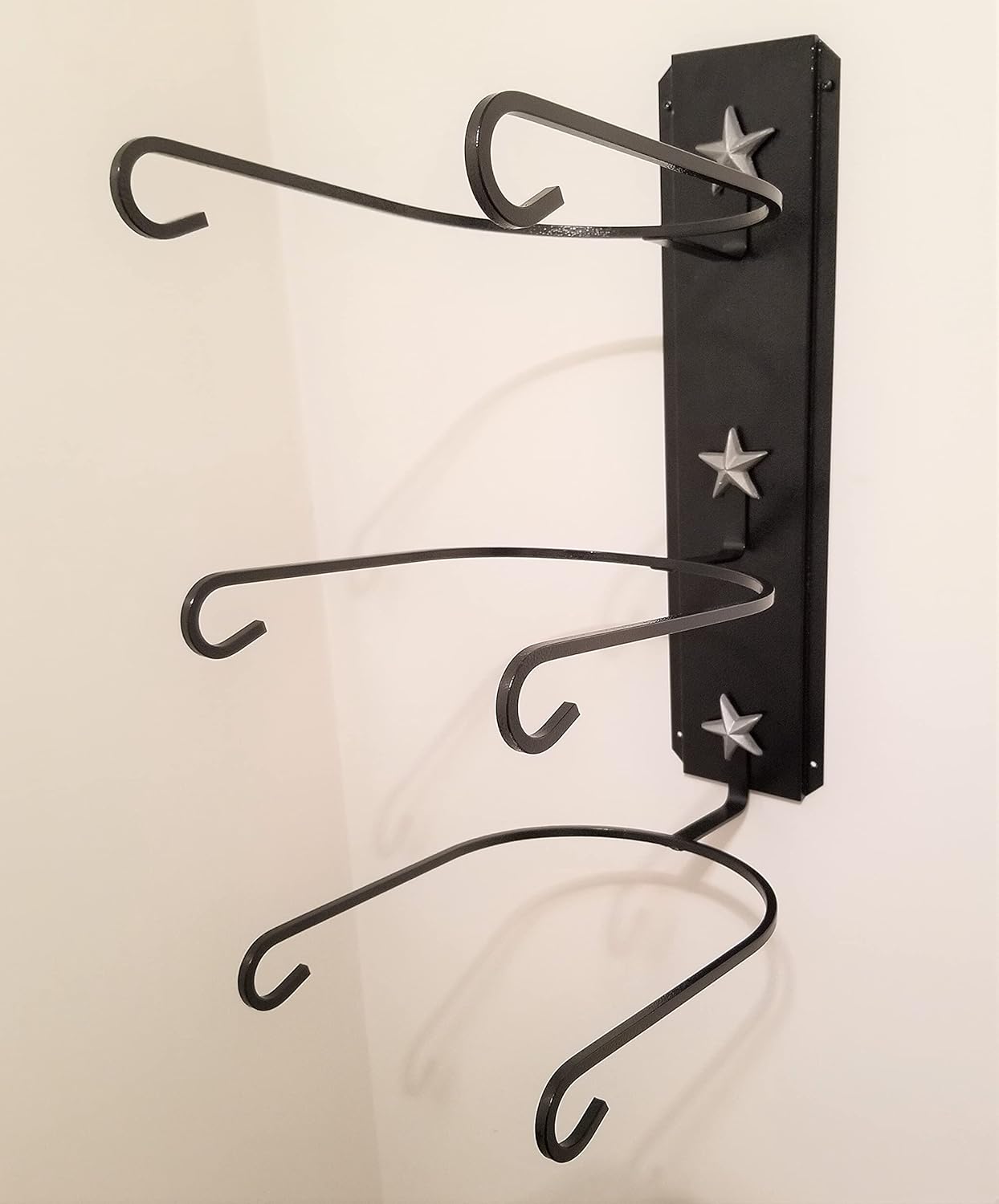 You will Love this Cowboy Hat Holder Holds Easily Up to Three Cowboy Hats Designed to Keep Your Hats Shape Looks Great on any wall. The decorative Stars Make this hat rack great Western Wall Art as well. Proudly Made in The USA Hand Finished and Powder Coated Wall Mounting Hardware is included Please note product may vary slightly from photos. NEW Improved U shape bracket for easier access to your caps, trucker hats & keys. Some assembly required (7/16 end wrench or socket is required for simple assembly).