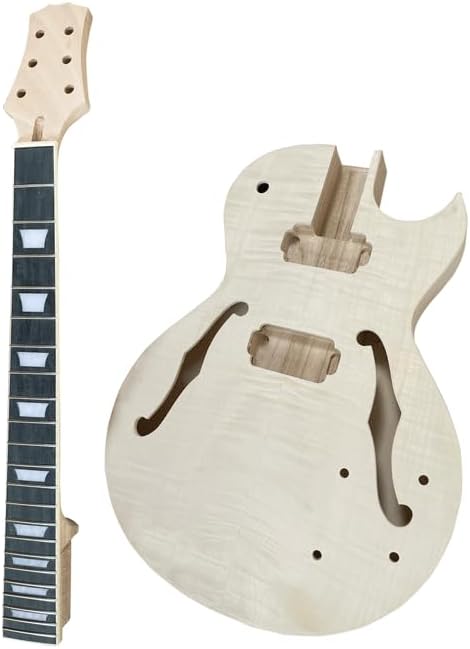 Difficulty Level: BeginnerDIY Guitar Kit: - Build Your Own Electric Guitar Pack ,All Pickups, Hardware and Components Included.﹣The DIY electric guitar kit provides you with all the necessary components for a beginner level build.﹣ Ever wanted to build your own guitar? Now you can with this practical DIY guitar kit. With all of the hardware and components provided, along with an unfinished Semi-Hollow Mahogany body with flame maple veneer top and Mahogany neck with a Rosewood fretboard with rectangle inlay, you have everything you need to make a unique style guitar. ﹣The DIY guitar kit is a great value pack that offers you the opportunity to build your own guitar. Without any of thehassle and expense of sourcing all of the parts, everything you need is in one box! ﹣Providing you with all the necessary top quality parts and hardware, you are sure to get a great sounding guitar,as well as the fun and satisfaction of building your own instrument.Description:1 YEAR QUALITY GUARANTEE ﹣Set-in Mahogany Neck﹣Mahogany Body﹣Rosewood Fingerboard with rectangle inlay﹣Die-cast Chrome Machine Heads﹣628mm//24.75" Scale Length, 22 Frets﹣2V, 2T, 3-Way Selector﹣H-H Pickups﹣Tune-o-Matic bridge﹣Chrome Hardware