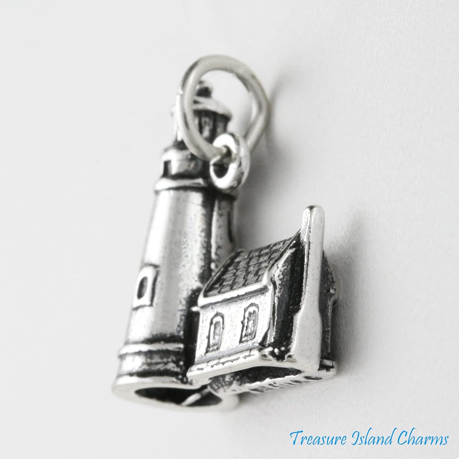 Heceta Head Lighthouse Oregon 3D .925 sterling silver charm or pendant. The charm is hallmarked, comes with a 6mm sterling silver keychain/split ring, and can fit a traditional charm bracelet or a chain necklace.