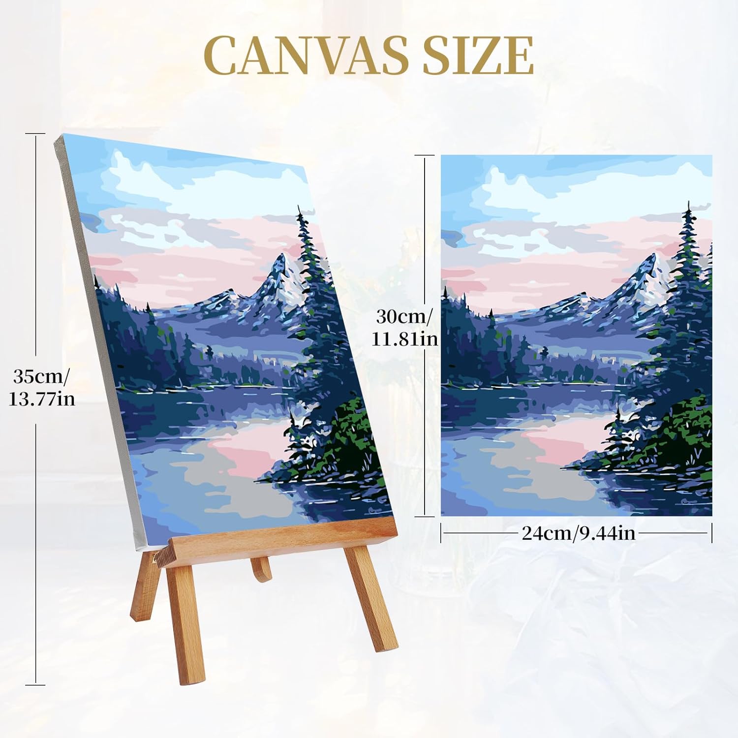 | Included Components | 4 pre-printed canvases already stretched on wooden frames, 1 wooden easel, 16 paint brushes, 4 acrylic paint sets, 4 postcards, 1 gift box |